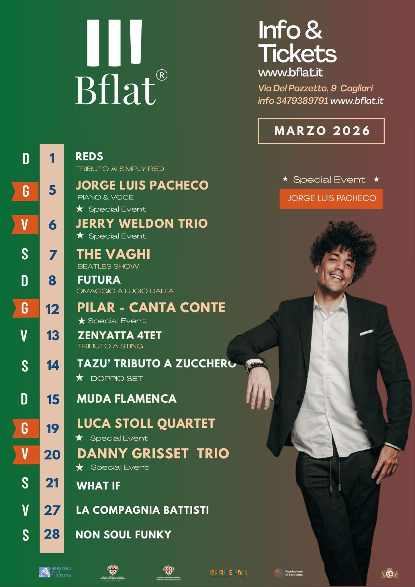 NONSOULFUNKY Nicola Marogna - voce Elisabetta Delogu - voce Stefano Montalbano - chitarre Simone Belfiori - tastiere Roberto Portincasa - basso Sergio Orrù - batteria Ingresso 5 euro (compreso tavolo)